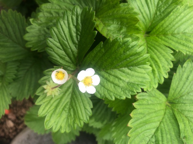 可愛らしい小さな白い花のあと、小さなイチゴの実を付けます。