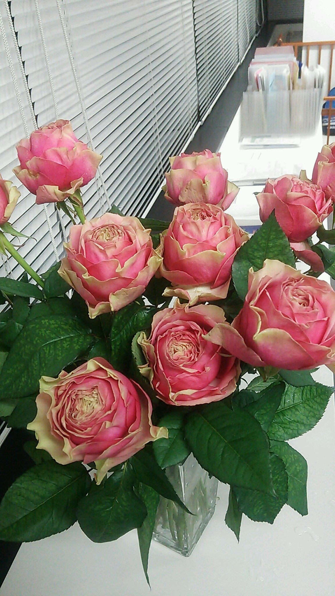 薔薇 2014.01.28 今日は一日相談員を務めました 夜になってお花の貿易会社さんより こんなゴージャスな薔薇の花束をいただきました ピンクの花びらにベージュの縁取り かわいい色でしょ ほのかに甘い香りです 心がぱっと明るくなりました 心を明るくやさしくする香り いいですね