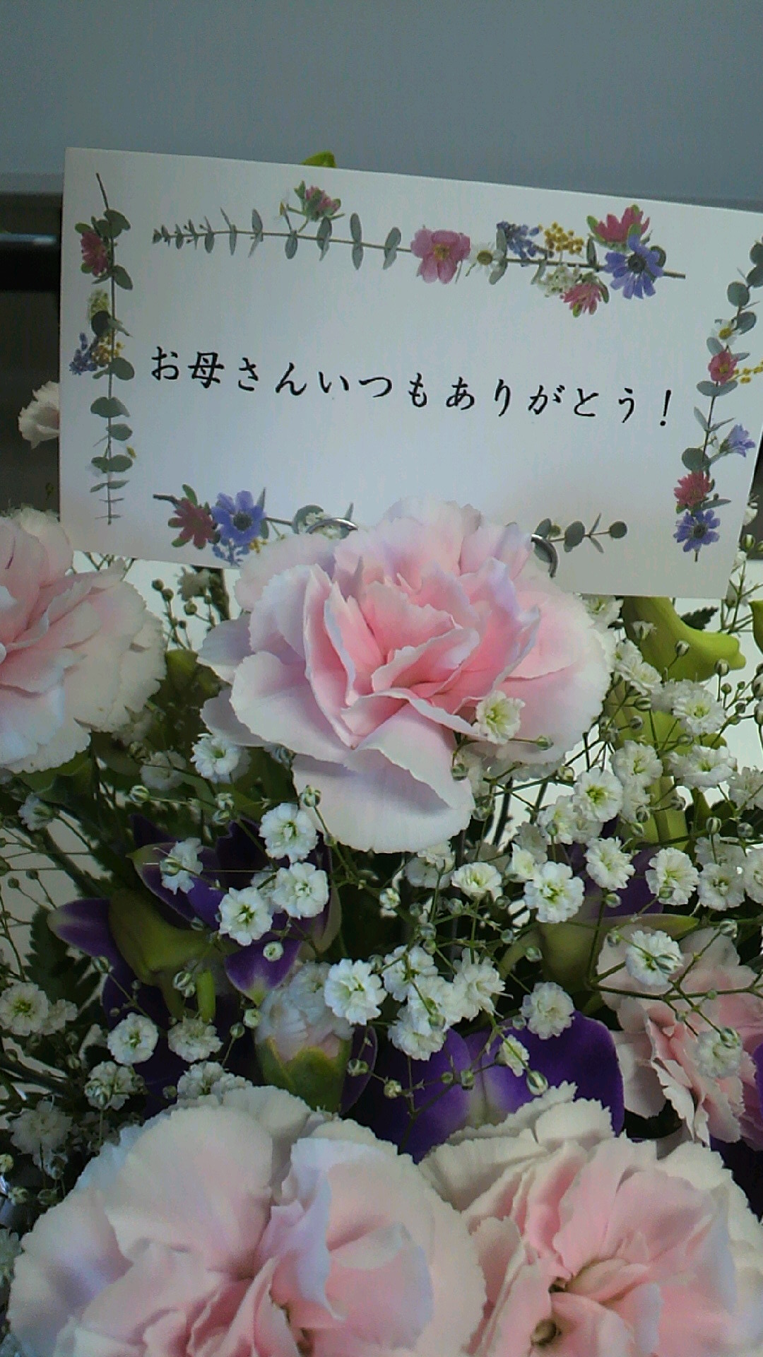 花キューピット 2013.05.12 カーネーションが生まれたのは旧ソ連のコーカサス地方 北緯四三度付近 北海道と同じくらいの緯度のようです なので寒さにつよいものの暑さには弱い花 毎日水をかえて水温が上がらないようにして長持ちさせるね! こちらこそありがと! 母\\(^^)//~~~